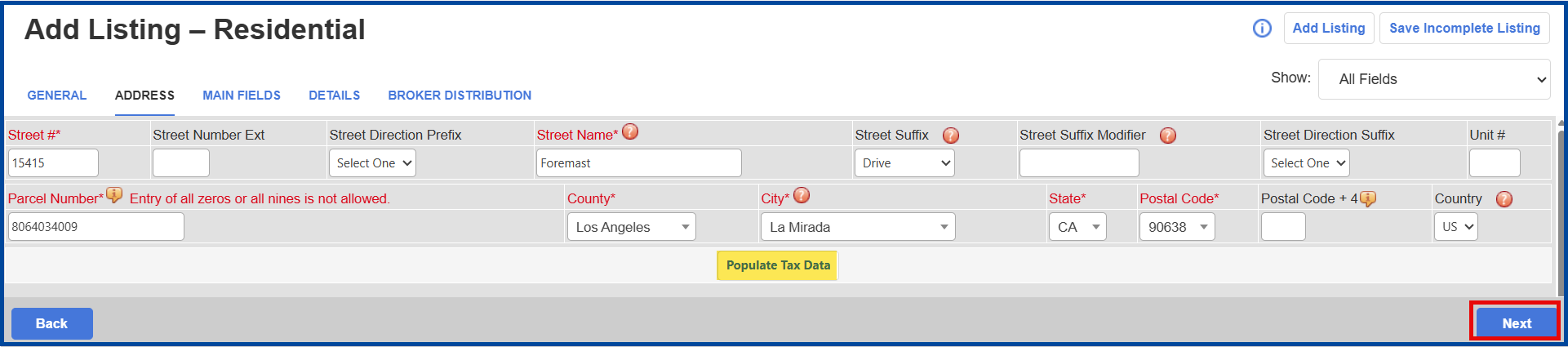 If you are finished in the Main Fields tab, click Next at the bottom right of the page to continue.