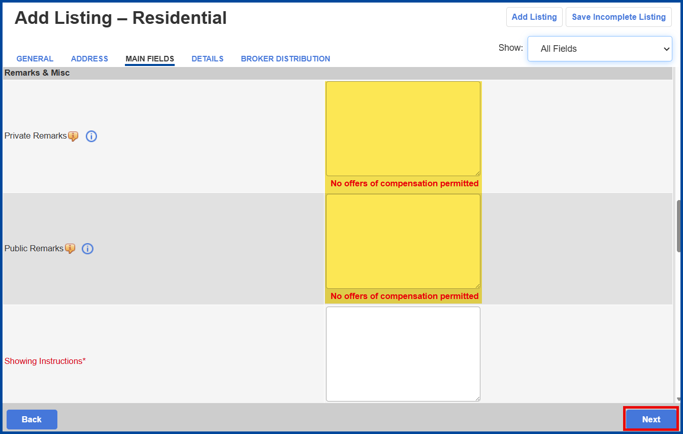 Your listing will save as incomplete. Select Listing Information to continue entering required listing details and verify auto-populated fields for accuracy.
