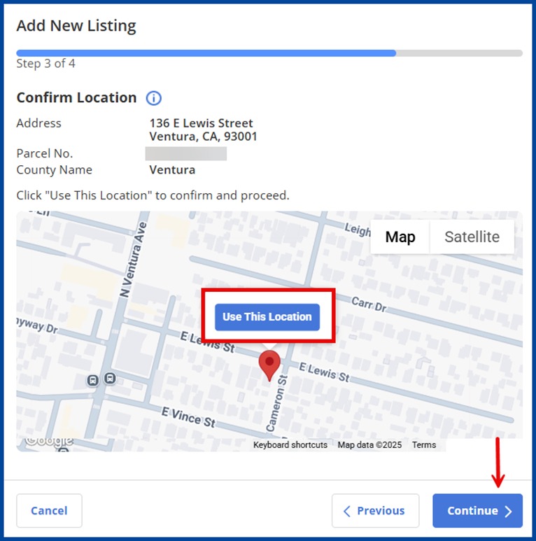 Click Use This Location on the display map to confirm the listing’s geo location and verify its address, then click Continue.