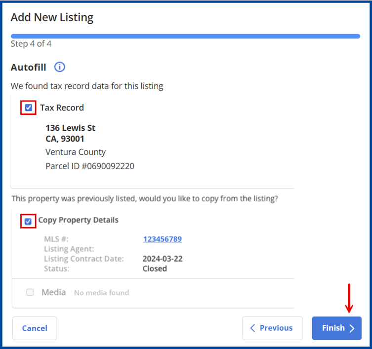 Select an AutoFill data option to locate tax data and your previous listing data (if applicable) to automatically add any available data, then click Finish.