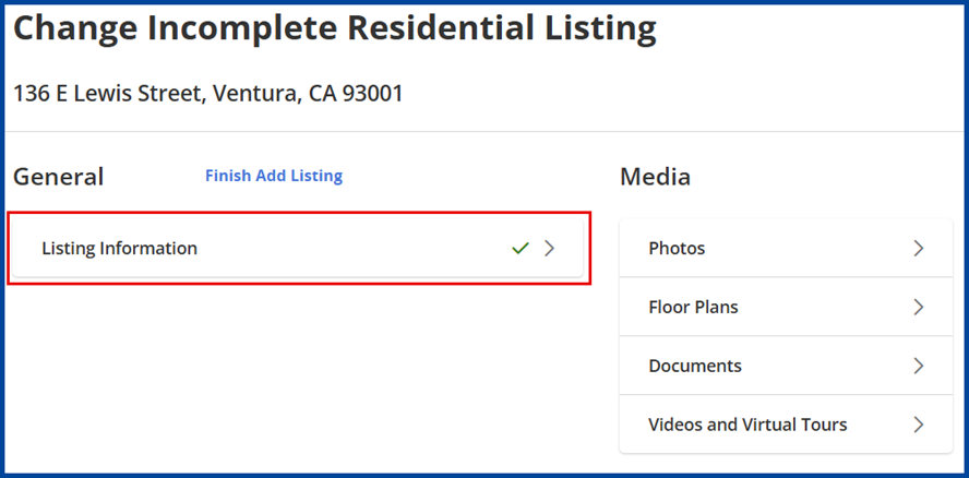 Your listing will save as incomplete. Select Listing Information to continue entering required listing details and verify auto-populated fields for accuracy.