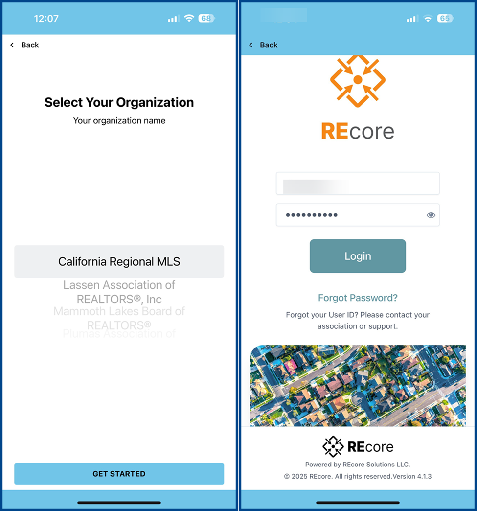 From there, you will be prompted to select your organization. Select California Regional MLS, then click the Get Started button. You’ll then be redirected to the REcore login page, where you can enter your MLS credentials. Click Login to continue.