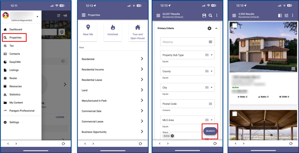 Searching on the app is the same process as searching on the desktop version of Paragon Connect. Start by clicking the menu icon, then select Properties. After you select the property class, enter your criteria and click search to view your results.