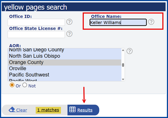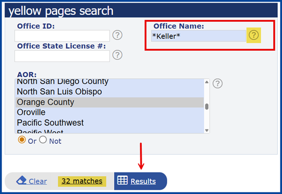 Use asterisks (*) to view all results containing a specific word (e.g., *Keller* finds all offices with “Keller” in the name)