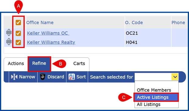 C: Select Active Listings in the “Search selected for” drop-down