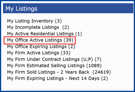 From the homepage, use the “My Listings” widget to access your office or firm’s inventory.