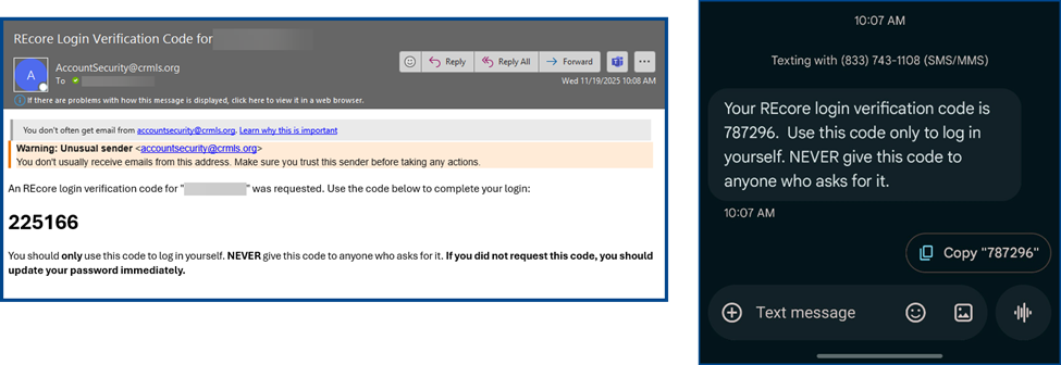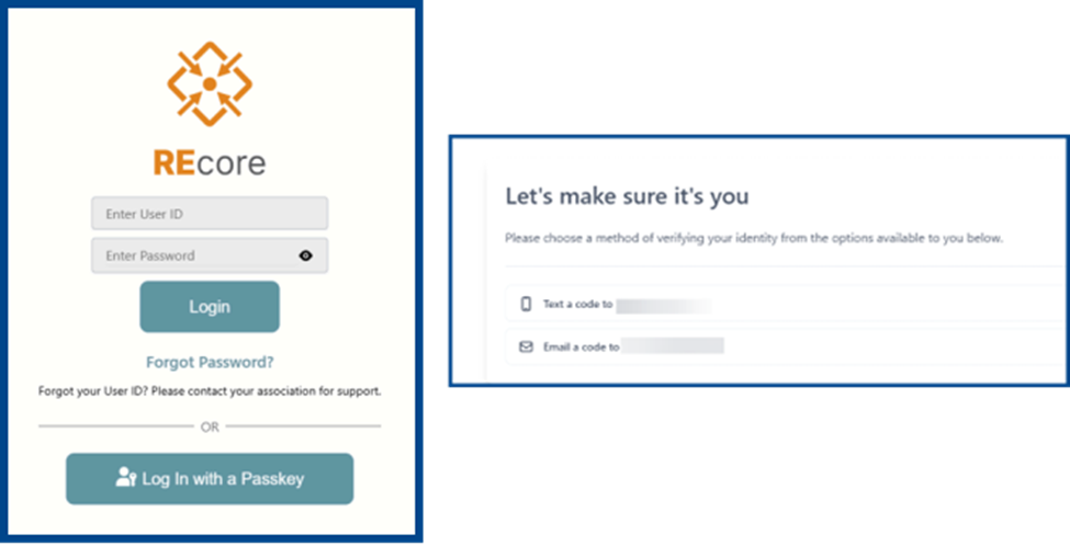 Log in to your REcore dashboard. When prompted, choose to either send a text message or email to verify your identity. Your contact details from the agent roster will display automatically.