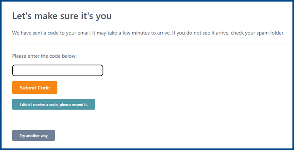 After choosing your verification method, retrieve the confirmation code sent to you via email or text. Enter the code in the verification field to confirm your identity.