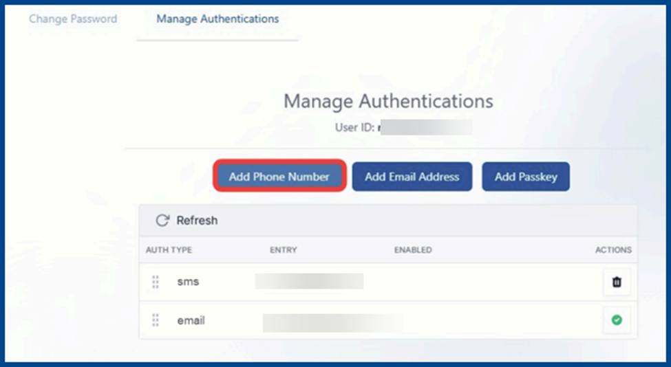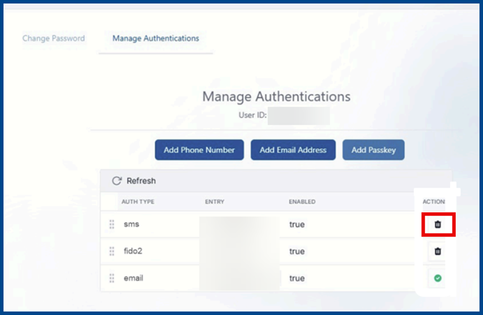 Your entry will appear on the authentication list once the code is entered. To remove an authentication type, click the trash can icon and click OK.