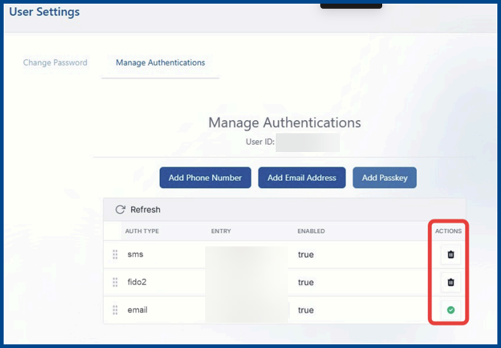Click on the icons under the Actions column to enable or disable your chosen authentication type.