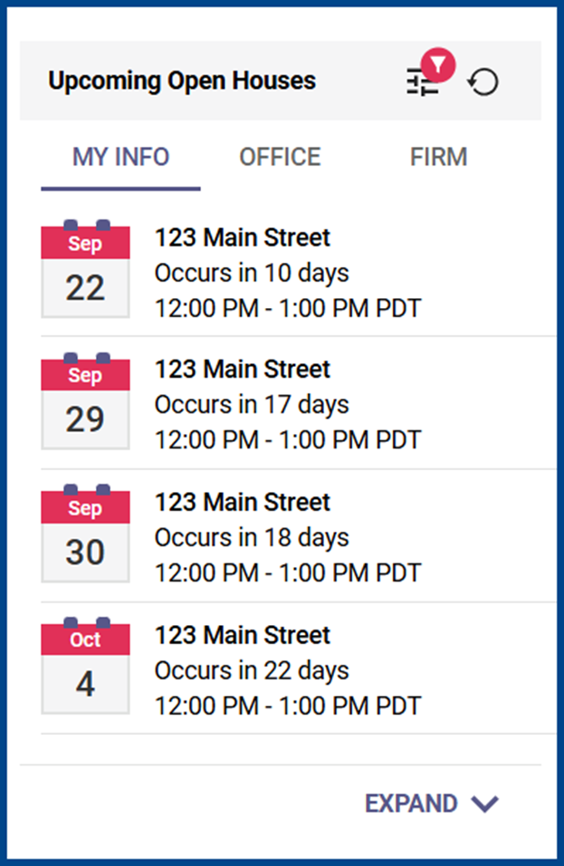 The Upcoming Open Houses widget provides an at-a-glance view of listings with scheduled open houses. It’s organized into three tabs: My Info, Office, and Firm, each with different essential details.