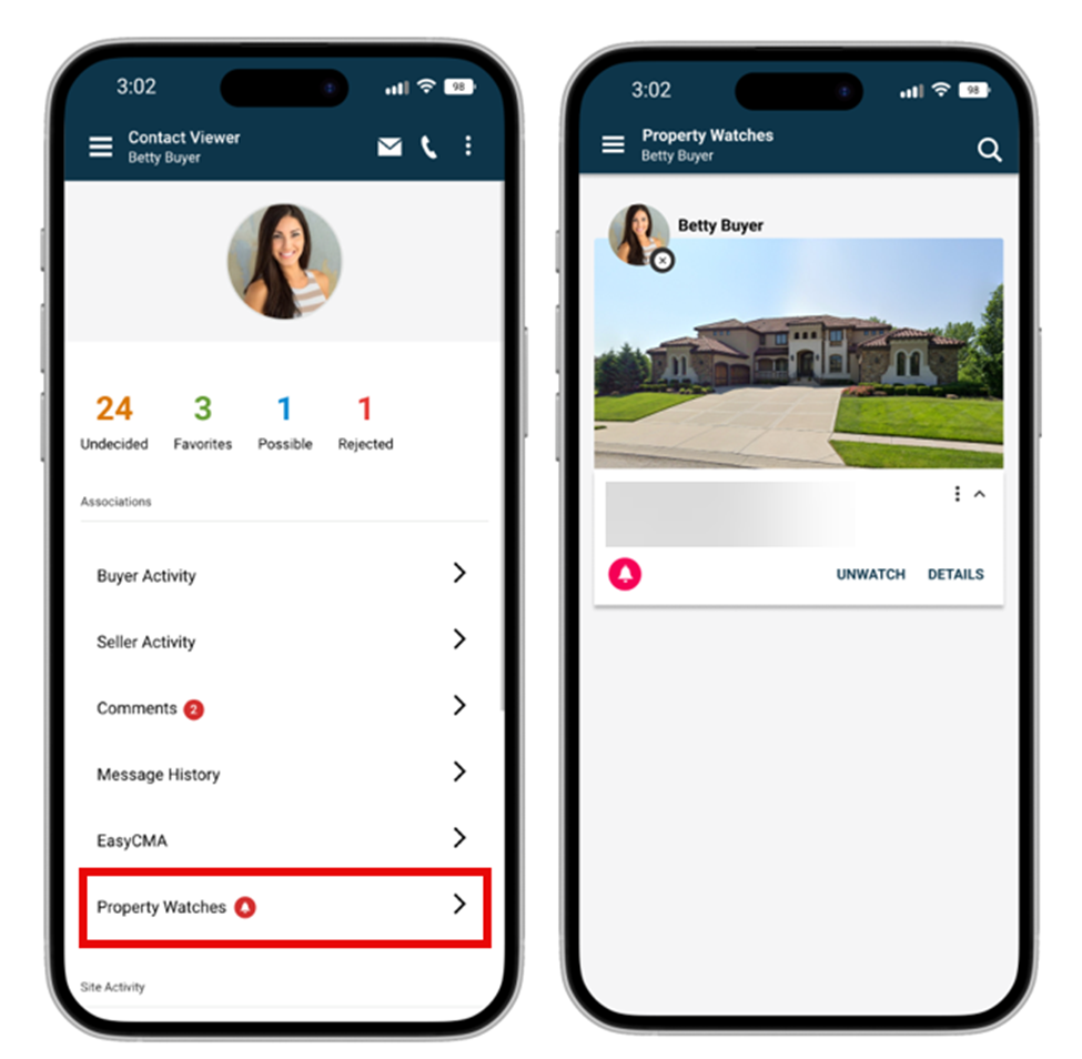 Found under My Content, the Property Watches page features a property profile thumbnail with the following enhancements: