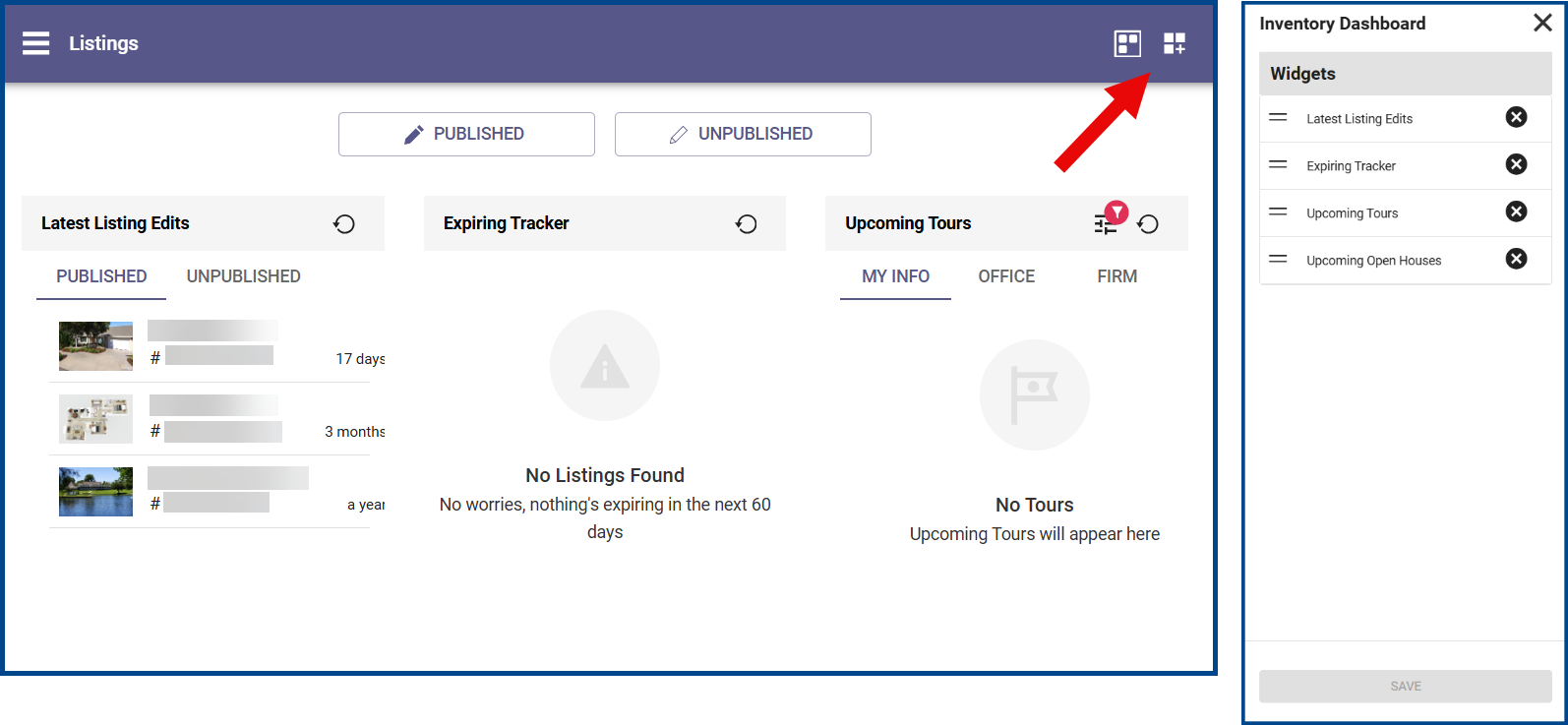 The Latest Listing Edits widget provides quick access to your most recently updated listings and is organized into two tabs: Published and Unpublished. While five to six listings will be displayed automatically, the widget can expand to accommodate up to ten.