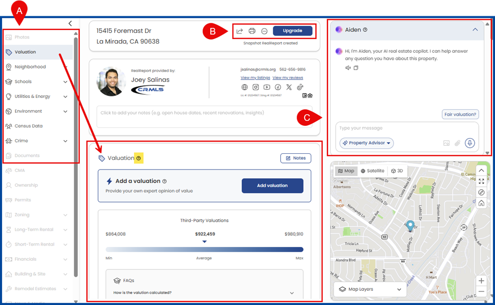 C: Ask questions to Aiden, the AI property advisor, in the chat box on the right.