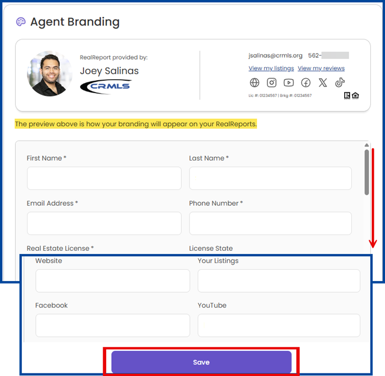 Note: The live preview shows how your branding will appear on the RealReport.
